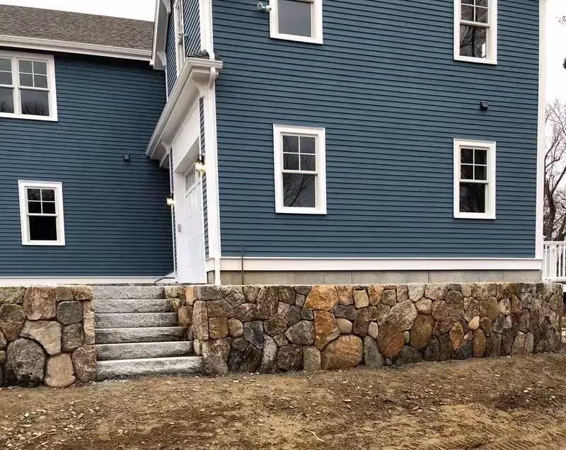 We started by grading and excavating the area for a solid foundation. The wall was constructed using locally sourced fieldstone, while the granite steps were installed to ensure safety and uniform rise for ease of use.